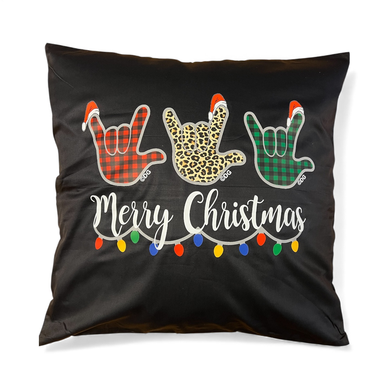 ASL SIGN LANGUAGE " I LOVE YOU" 3 HANDS WITH MERRY CHRISTMAS LIGHTS PILLOW (BLACK PILLOW)