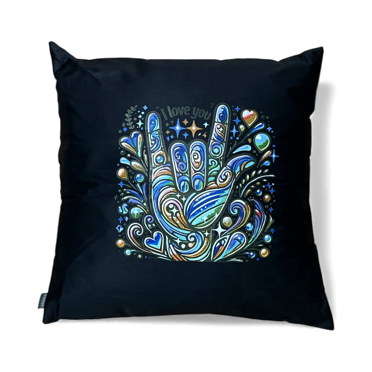 ASL SIGN LANGUAGE " I LOVE YOU" BLUE NEON, TAN & TEAL GREEN SWIRL HAND PILLOW, APPROX SIZE 18" X 18", GREAT FOR GIFTS. Made in USA, " DeafGifts Exclusive !!
