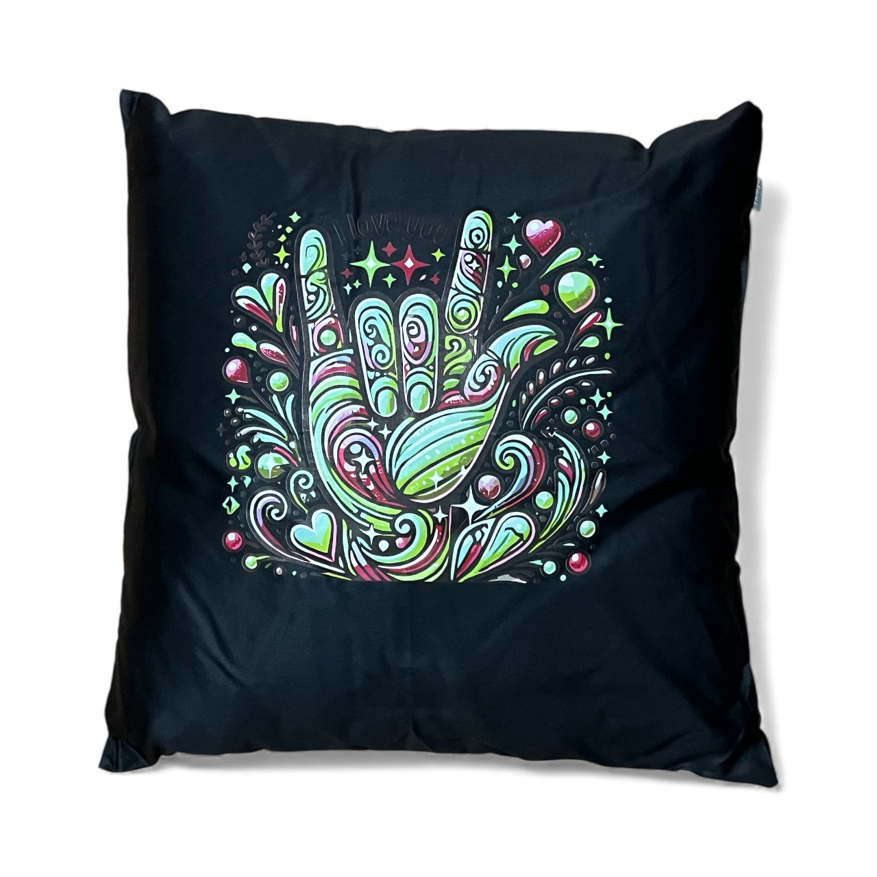 ASL SIGN LANGUAGE " I LOVE YOU" GREEN NEON, MAROON SWIRL HAND PILLOW, APPROX SIZE 18" X 18", GREAT FOR GIFTS. Made in USA, " DeafGifts Exclusive !!