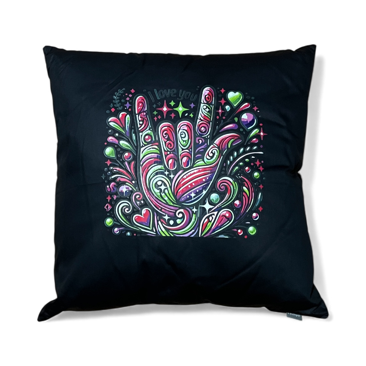 ASL SIGN LANGUAGE " I LOVE YOU" GREEN NEON, PURPLE & PINK SWIRL HAND PILLOW, APPROX SIZE 18" X 18", GREAT FOR GIFTS. Made in USA, " DeafGifts Exclusive !!