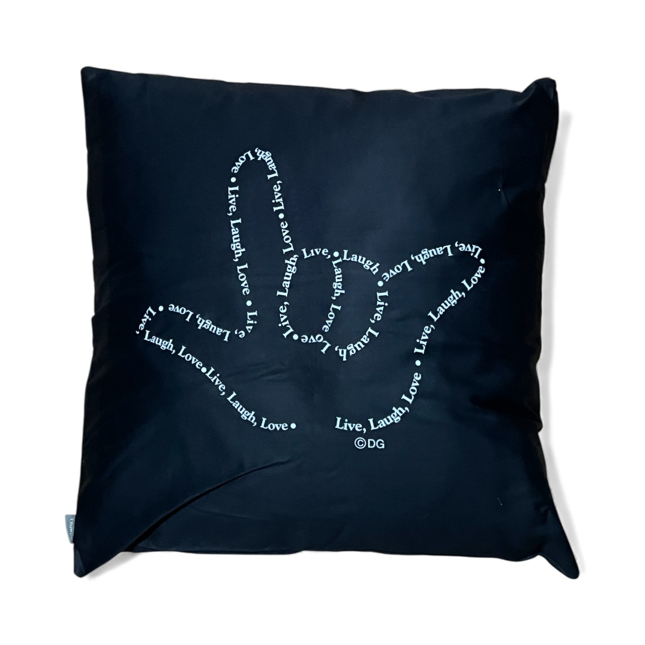 ASL SIGN LANGUAGE " I LOVE YOU" OUTLINE WORDS " LAUGH, LOVE & LIVE" WHITE PRINTING HAND BLACK PILLOW, APPROX SIZE 18" X 18", GREAT FOR GIFTS. Made in USA, " DeafGifts Exclusive !!