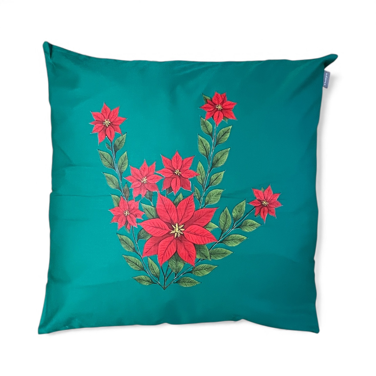 ASL SIGN LANGUAGE " I LOVE YOU" POINSETTIA OUTLINE HAND PILLOW (GREEN PILLOW)
