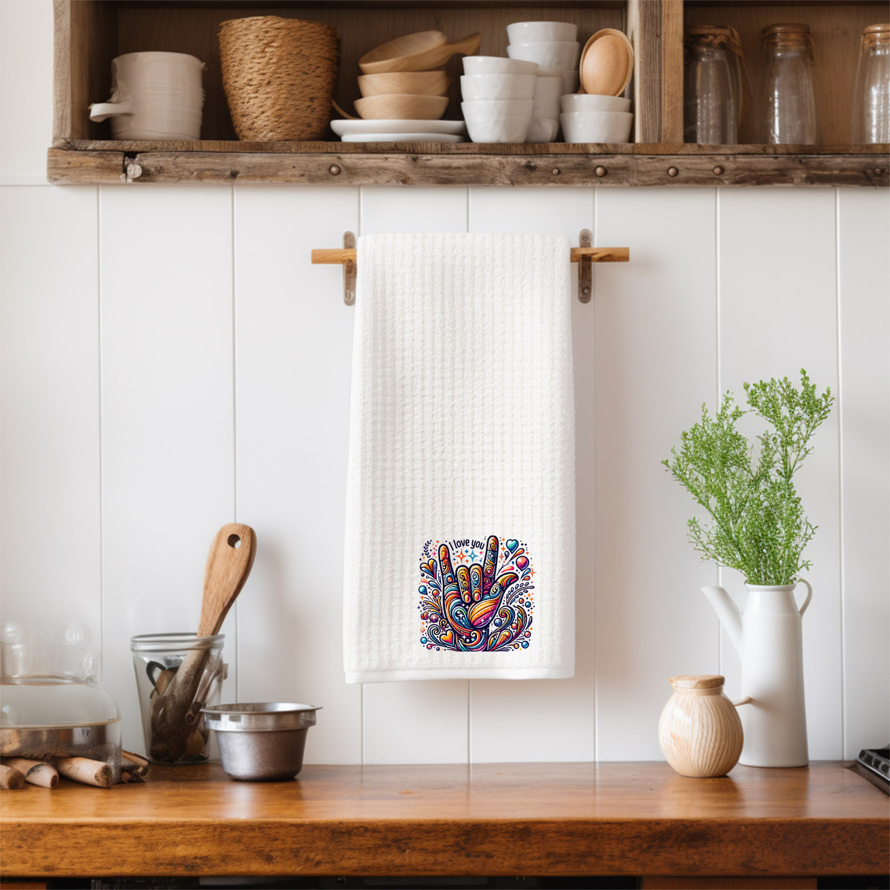 SIGN LANGUAGE ASL "I LOVE YOU" COLOR HAND ILY HAND KITCHEN TOWEL, 16 X 24 INCHES, MICROFIBER WAFFLE WEAVE TOWEL FAST DRYING ABSORBENT FOR HOME KITCHEN GIFTS, GREAT GIFTS OR YOURSELF...Made in USA, " DeafGifts Exclusive !!..