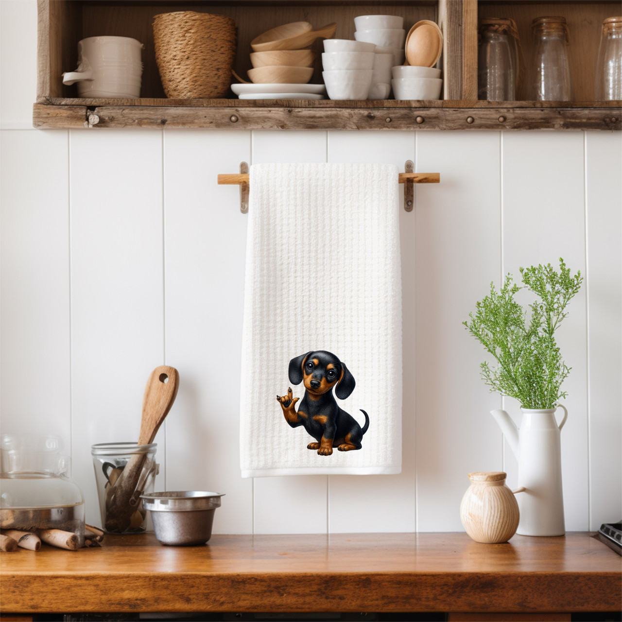 SIGN LANGUAGE ASL "I LOVE YOU" DACHSHAND BROWN & BLACK HAND ILY HAND KITCHEN TOWEL, 16 X 24 INCHES, MICROFIBER WAFFLE WEAVE TOWEL FAST DRYING ABSORBENT FOR HOME KITCHEN GIFTS, GREAT GIFTS OR YOURSELF...Made in USA, " DeafGifts Exclusive !!..