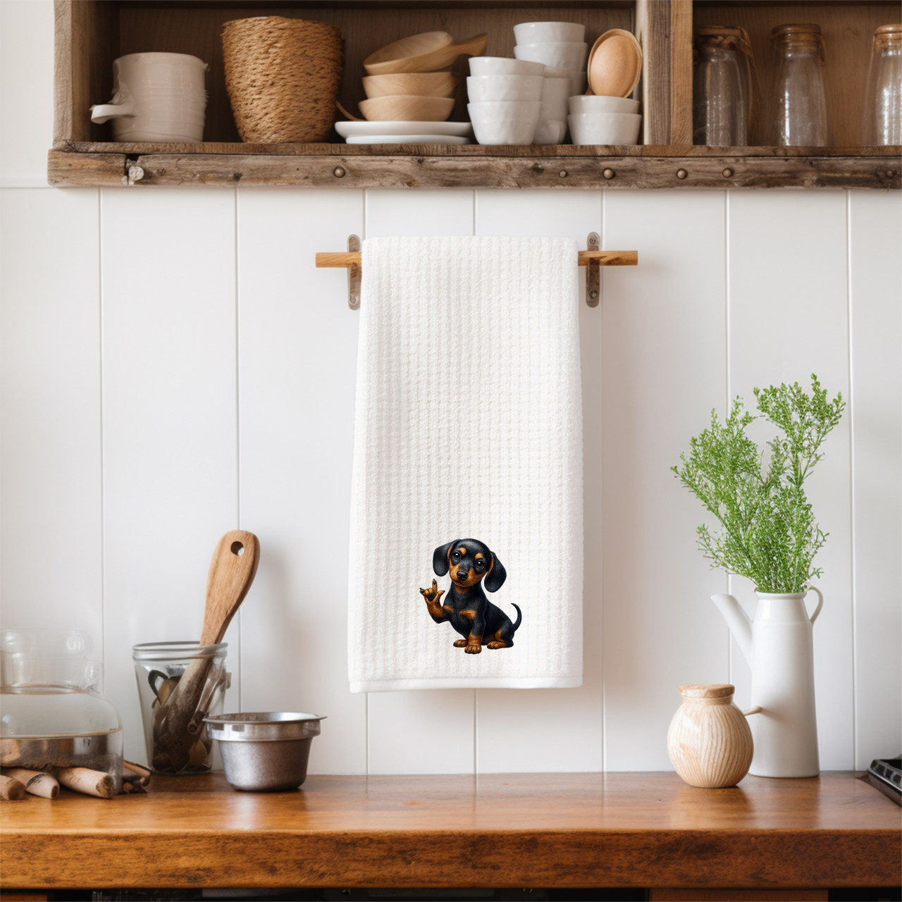 SIGN LANGUAGE ASL "I LOVE YOU" DACHSHUND (BLACK & BROWN) ILY HAND KITCHEN TOWEL, 16 X 24 INCHES, MICROFIBER WAFFLE WEAVE TOWEL FAST DRYING ABSORBENT FOR HOME KITCHEN GIFTS, GREAT GIFTS OR YOURSELF...Made in USA, " DeafGifts Exclusive !!..