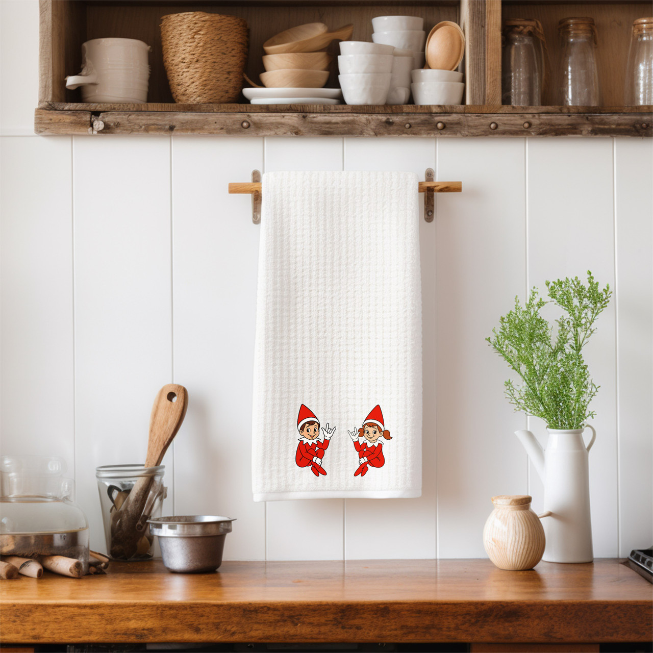 SIGN LANGUAGE ASL "I LOVE YOU" ELF GIRL AND BOY ILY HAND KITCHEN TOWEL, 16 X 24 INCHES, MICROFIBER WAFFLE WEAVE TOWEL FAST DRYING ABSORBENT FOR HOME KITCHEN GIFTS, GREAT GIFTS OR YOURSELF...Made in USA, " DeafGifts Exclusive !!