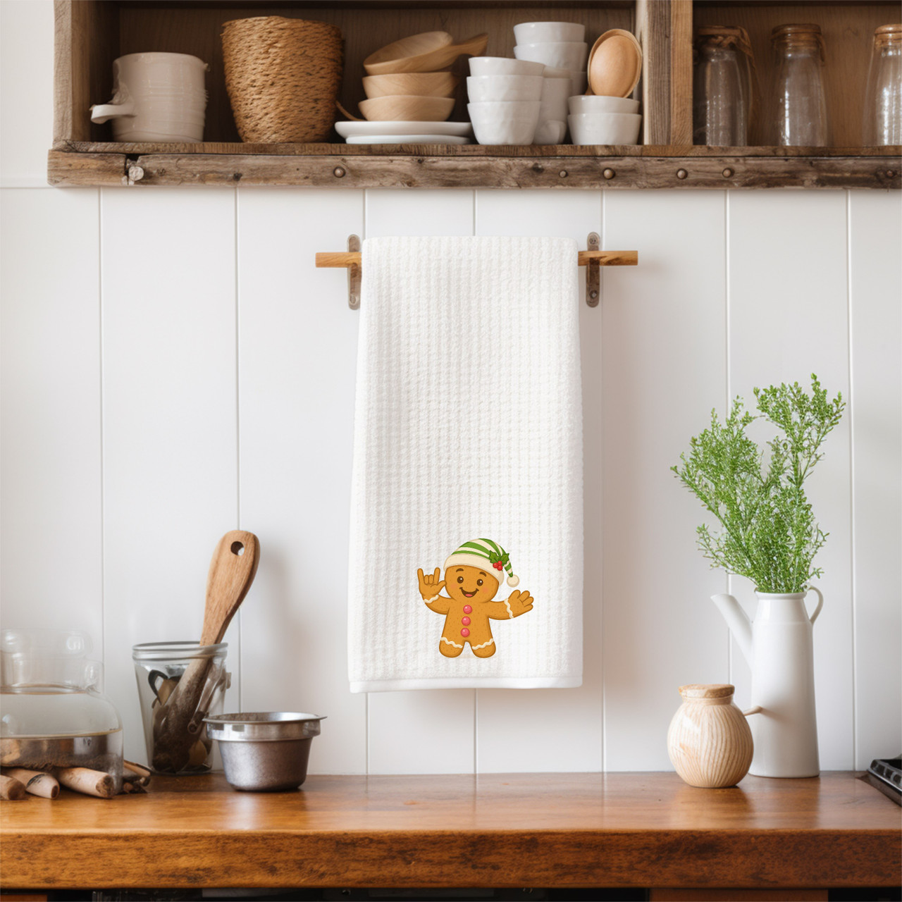 SIGN LANGUAGE ASL "I LOVE YOU" GINGERBREAD GREEN & WHITE HAT ILY HAND KITCHEN TOWEL, 16 X 24 INCHES, MICROFIBER WAFFLE WEAVE TOWEL FAST DRYING ABSORBENT FOR HOME KITCHEN GIFTS, GREAT GIFTS OR YOURSELF...Made in USA, " DeafGifts Exclusive !! "