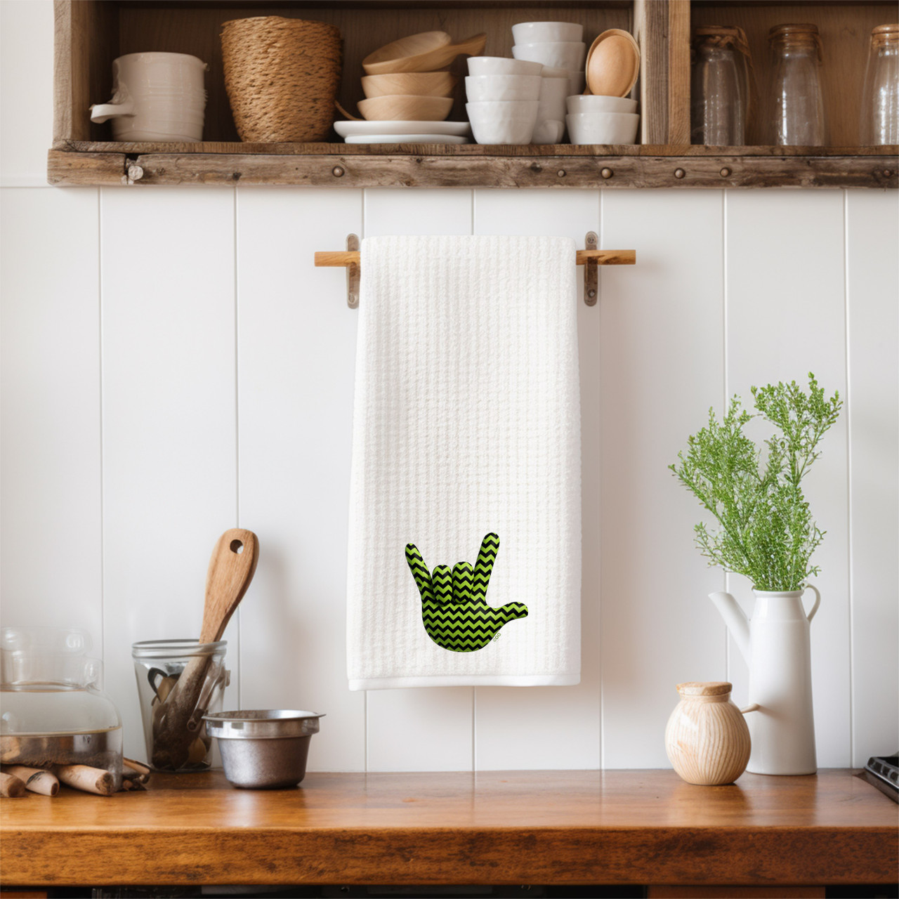 SIGN LANGUAGE ASL "I LOVE YOU" GREEN CHEVON 3D HAND ILY HAND KITCHEN TOWEL, 16 X 24 INCHES, MICROFIBER WAFFLE WEAVE TOWEL FAST DRYING ABSORBENT FOR HOME KITCHEN GIFTS, GREAT GIFTS OR YOURSELF...Made in USA, " DeafGifts Exclusive !!..