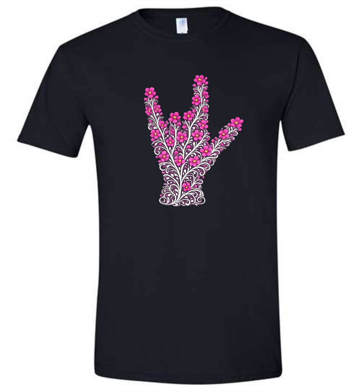 SIGN LANGUAGE ASL I LOVE YOU HAND HOT PINK FLORAL BOTANICAL (CHOOSE SIZE AND COLOR SHIRT),