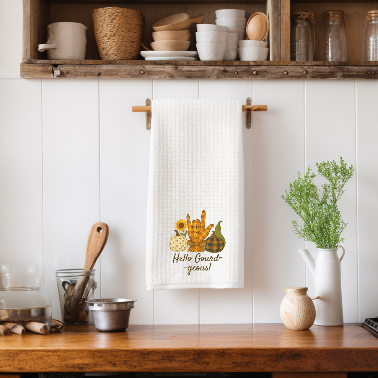 SIGN LANGUAGE ASL "I LOVE YOU" HELLO GOURD-GEOUS! ILY HAND KITCHEN TOWEL, 16 X 24 INCHES, MICROFIBER WAFFLE WEAVE TOWEL FAST DRYING ABSORBENT FOR HOME KITCHEN GIFTS, GREAT GIFTS OR YOURSELF...Made in USA, " DeafGifts Exclusive !!