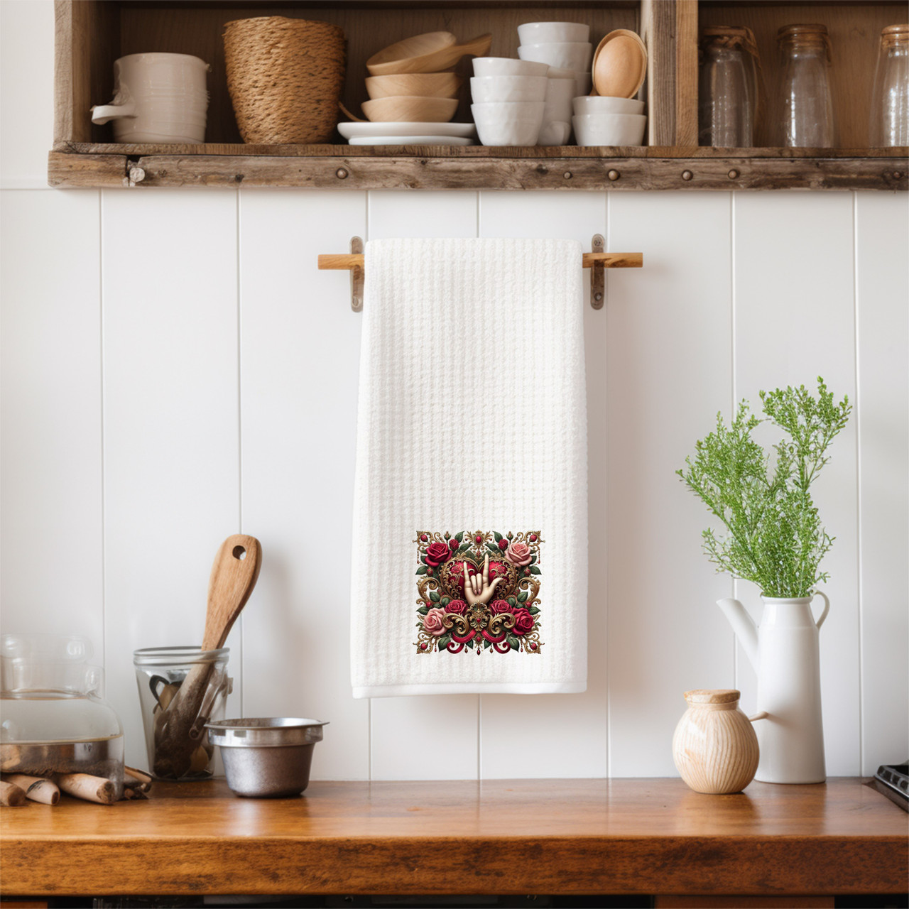 SIGN LANGUAGE ASL "I LOVE YOU" ROSE ROSE WITH PEACH HAND ILY HAND KITCHEN TOWEL, 16 X 24 INCHES, MICROFIBER WAFFLE WEAVE TOWEL FAST DRYING ABSORBENT FOR HOME KITCHEN GIFTS, GREAT GIFTS OR YOURSELF...Made in USA, " DeafGifts Exclusive !!..