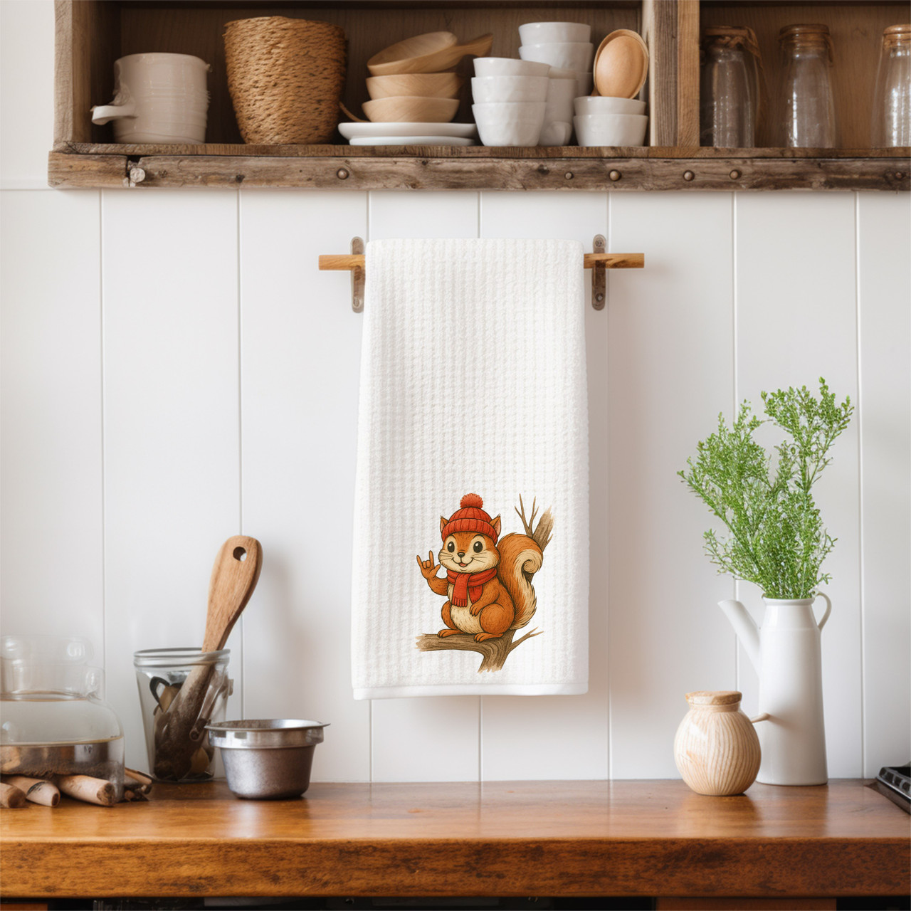 SIGN LANGUAGE ASL "I LOVE YOU" SQUIRREL HAT SCARF BRANCH ILY HAND KITCHEN TOWEL, 16 X 24 INCHES, MICROFIBER WAFFLE WEAVE TOWEL FAST DRYING ABSORBENT FOR HOME KITCHEN GIFTS, GREAT GIFTS OR YOURSELF...Made in USA, " DeafGifts Exclusive !!