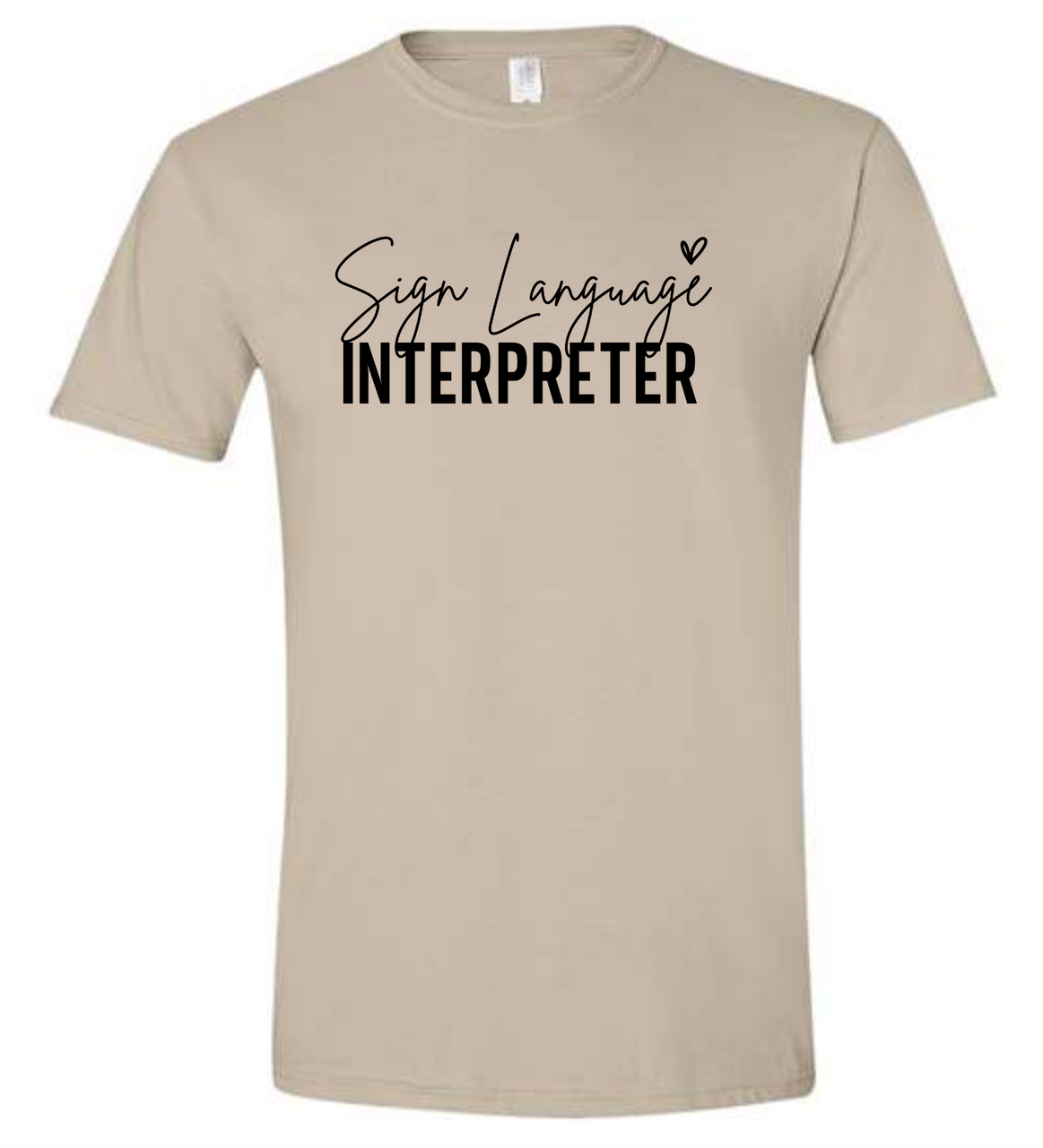 SIGN LANGUAGE ASL " INTERPRETER" WITH TINY HEART ( BLACK PRINTING ) (CHOOSE SIZE AND COLOR SHIRT),
