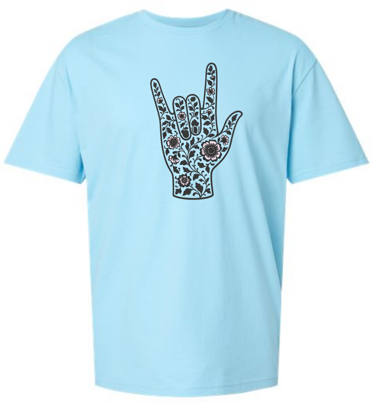 SIGN LANGUAGE I LOVE YOU ASL BLACK CHINOISERIE ILY HAND T SHIRT (ADULT) OR (YOUTH), Ultra Cotton Heavyweight Tee Features: 100% preshrunk heavyweight cotton, 6.1oz., seamless collar, taped neck and shoulders, double-needle throughout. CHOOSE COLOR SHIRT and CHOOSE SIZE, DeafGifts.com Exclusive !!