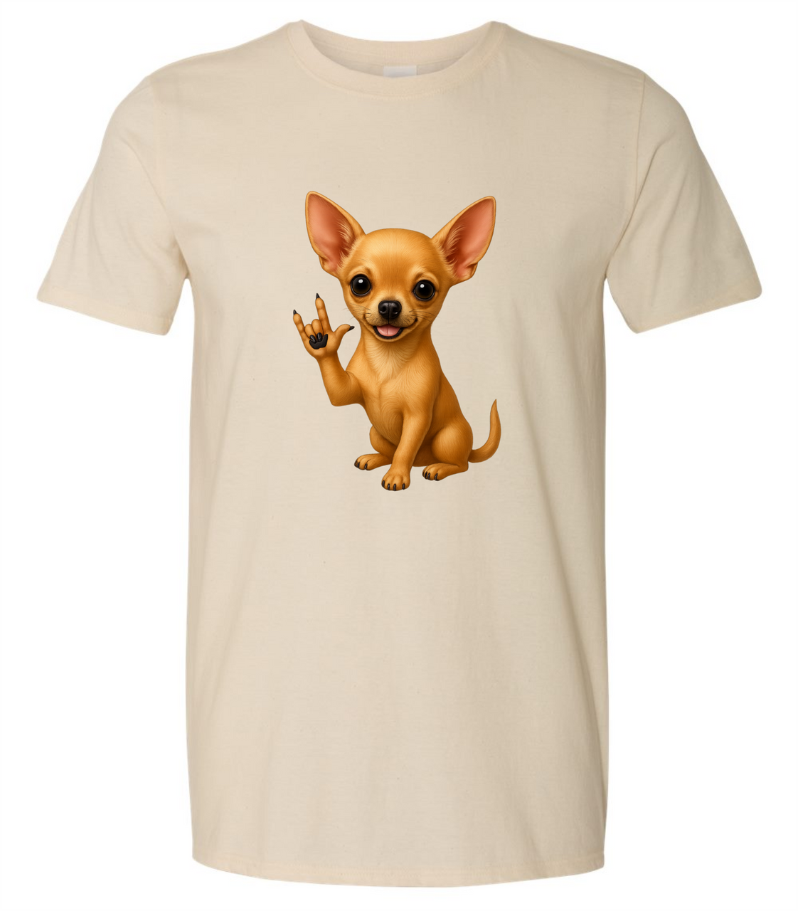 SIGN LANGUAGE I LOVE YOU ASL CHIHUAHUA DOG T SHIRT (ADULT) OR (YOUTH), Ultra Cotton Heavyweight Tee Features: 100% preshrunk heavyweight cotton, 6.1oz., seamless collar, taped neck and shoulders, double-needle throughout. CHOOSE COLOR SHIRT and CHOOSE SIZE, DeafGifts.com Exclusive