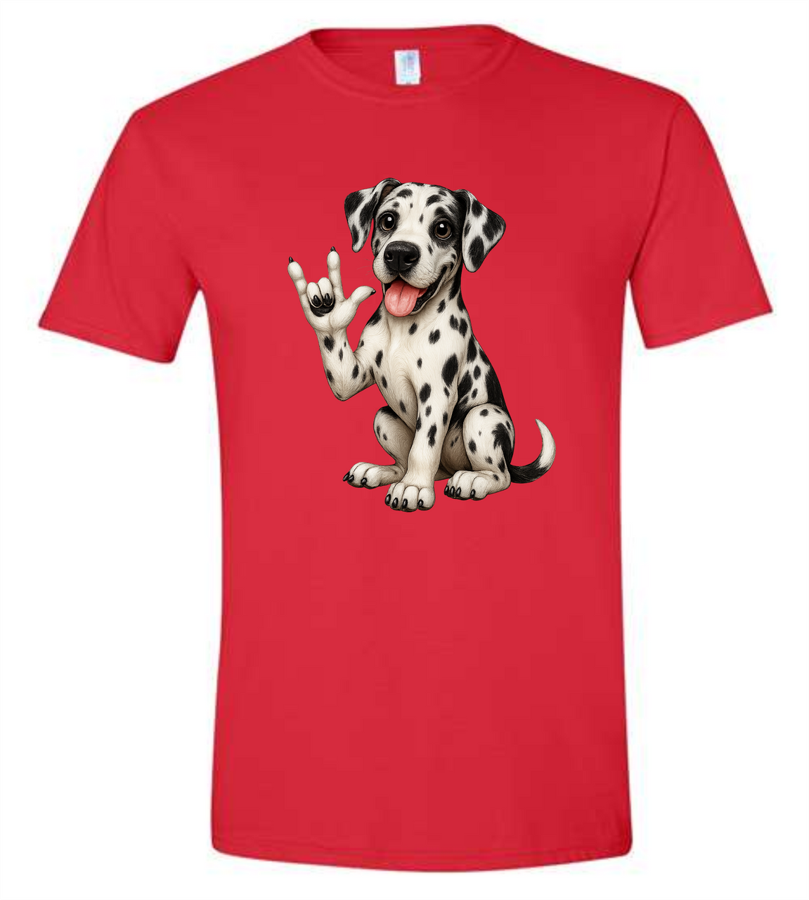 SIGN LANGUAGE I LOVE YOU ASL DALMATIAN DOG T SHIRT (ADULT) OR (YOUTH), Ultra Cotton Heavyweight Tee Features: 100% preshrunk heavyweight cotton, 6.1oz., seamless collar, taped neck and shoulders, double-needle throughout. CHOOSE COLOR SHIRT and CHOOSE SIZE, DeafGifts.com Exclusive