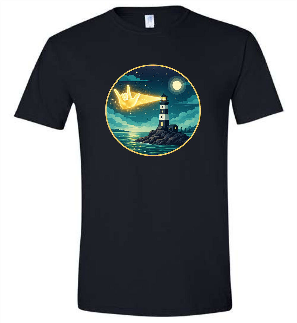 SIGN LANGUAGE I LOVE YOU ASL LIGHTHOUSE BLACK AND WHITE WITH BEAM HAND ROUND (ADULT) OR (YOUTH), Ultra Cotton Heavyweight Tee Features: 100% preshrunk heavyweight cotton, 6.1oz., seamless collar, taped neck and shoulders, double-needle throughout. CHOOSE COLOR SHIRT and CHOOSE SIZE, DeafGifts.com Exclusive