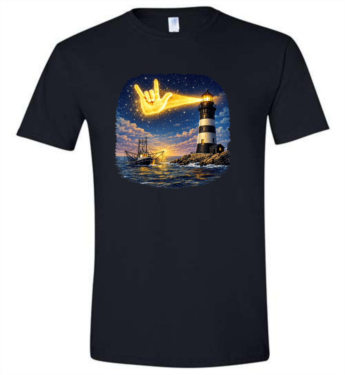 SIGN LANGUAGE I LOVE YOU ASL LIGHTHOUSE BLACK AND WHITE WITH BEAM HAND WITH SHRIMP BOAT (ADULT) OR (YOUTH), Ultra Cotton Heavyweight Tee Features: 100% preshrunk heavyweight cotton, 6.1oz., seamless collar, taped neck and shoulders, double-needle throughout. CHOOSE COLOR SHIRT and CHOOSE SIZE, DeafGifts.com Exclusive