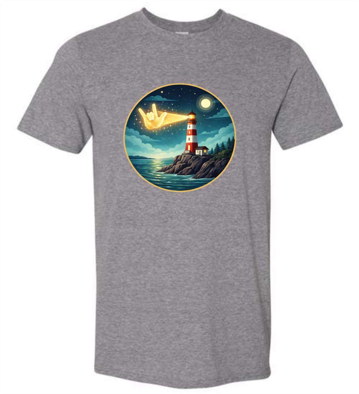 SIGN LANGUAGE I LOVE YOU ASL LIGHTHOUSE RED AND WHITE WITH BEAM HAND ROUND (ADULT) OR (YOUTH), Ultra Cotton Heavyweight Tee Features: 100% preshrunk heavyweight cotton, 6.1oz., seamless collar, taped neck and shoulders, double-needle throughout. CHOOSE COLOR SHIRT and CHOOSE SIZE, DeafGifts.com Exclusive