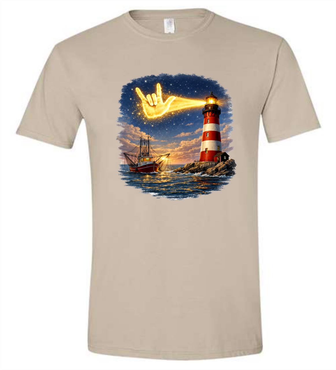 SIGN LANGUAGE I LOVE YOU ASL LIGHTHOUSE RED AND WHITE WITH BEAM HAND WITH SHRIMP BOAT (ADULT) OR (YOUTH), Ultra Cotton Heavyweight Tee Features: 100% preshrunk heavyweight cotton, 6.1oz., seamless collar, taped neck and shoulders, double-needle throughout. CHOOSE COLOR SHIRT and CHOOSE SIZE, DeafGifts.com Exclusive