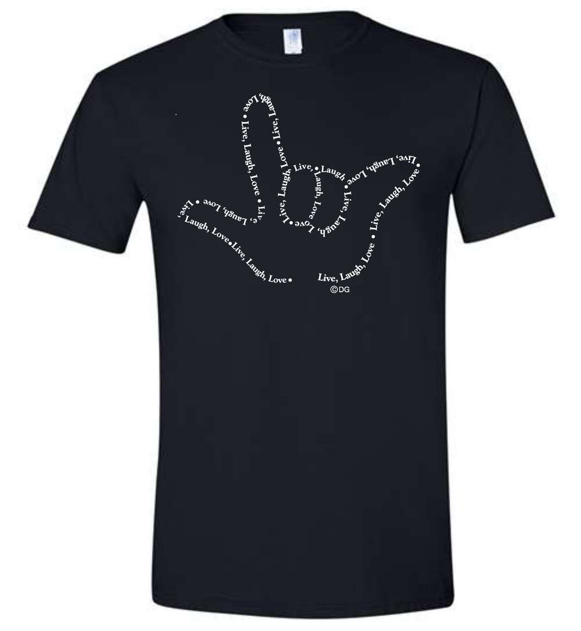 SIGN LANGUAGE I LOVE YOU ASL OUTLINE HAND "LIVE, LAUGH, LOVE T SHIRT (WHITE PRINTING) (ADULT) OR (YOUTH), Ultra Cotton Heavyweight Tee Features: 100% preshrunk heavyweight cotton, 6.1oz., seamless collar, taped neck and shoulders, double-needle throughout. CHOOSE COLOR SHIRT and CHOOSE SIZE, DeafGifts.com Exclusive!!