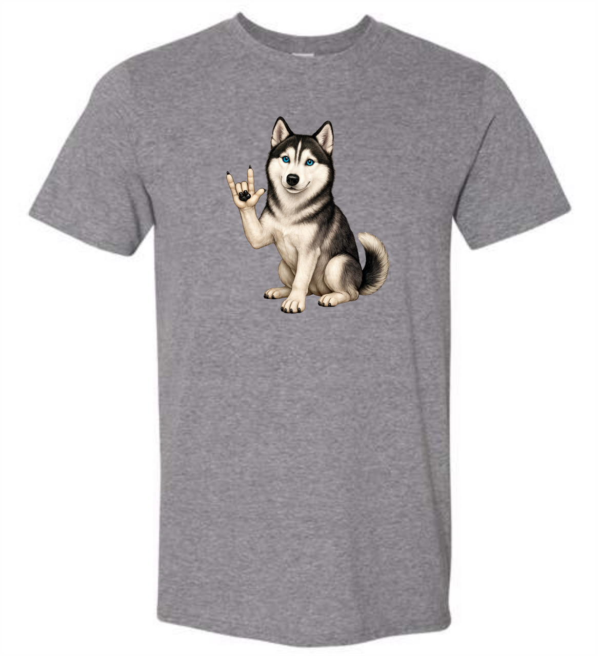SIGN LANGUAGE I LOVE YOU ASL SIBERIAN HUSKY HAND T SHIRT (ADULT) OR (YOUTH), Ultra Cotton Heavyweight Tee Features: 100% preshrunk heavyweight cotton, 6.1oz., seamless collar, taped neck and shoulders, double-needle throughout. CHOOSE COLOR SHIRT and CHOOSE SIZE, DeafGifts.com Exclusive