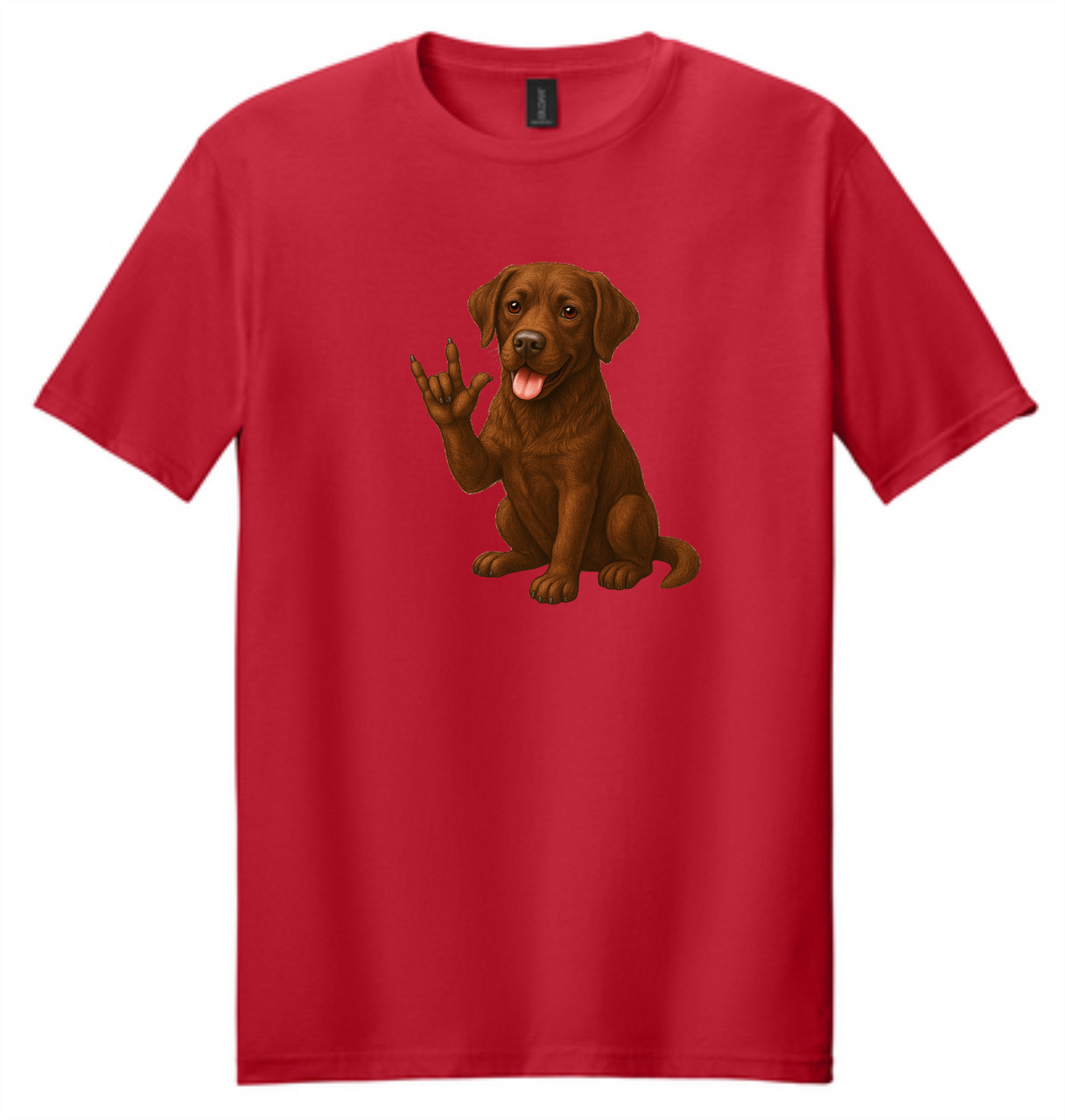SIGN LANGUAGE I LOVE YOU CHOCOLATE LAB DOG T SHIRT (ADULT) OR (YOUTH), Ultra Cotton Heavyweight Tee Features: 100% preshrunk heavyweight cotton, 6.1oz., seamless collar, taped neck and shoulders, double-needle throughout. CHOOSE COLOR SHIRT and CHOOSE SIZE, DeafGifts.com Exclusive