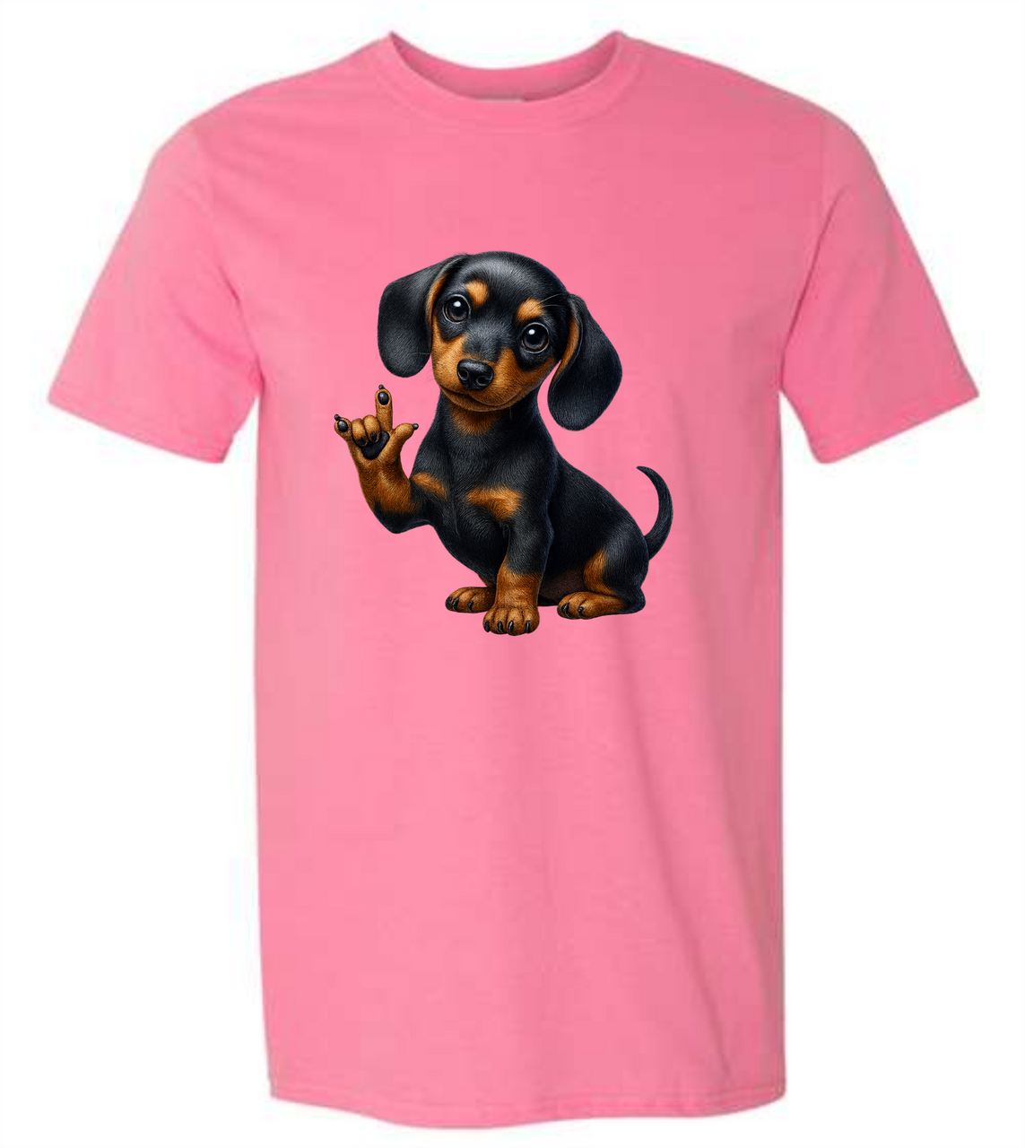 SIGN LANGUAGE I LOVE YOU DACHSHUND BLACK & BROWN DOG T SHIRT (ADULT) OR (YOUTH), Ultra Cotton Heavyweight Tee Features: 100% preshrunk heavyweight cotton, 6.1oz., seamless collar, taped neck and shoulders, double-needle throughout. CHOOSE COLOR SHIRT and CHOOSE SIZE, DeafGifts.com Exclusive
