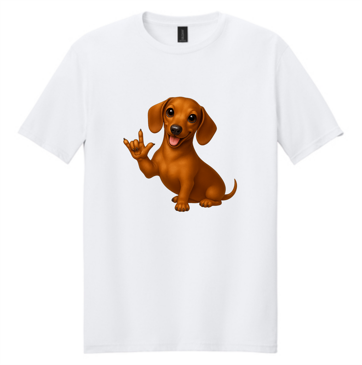 SIGN LANGUAGE I LOVE YOU DACHSHUND BROWN DOG T SHIRT (ADULT) OR (YOUTH), Ultra Cotton Heavyweight Tee Features: 100% preshrunk heavyweight cotton, 6.1oz., seamless collar, taped neck and shoulders, double-needle throughout. CHOOSE COLOR SHIRT and CHOOSE SIZE, DeafGifts.com Exclusive